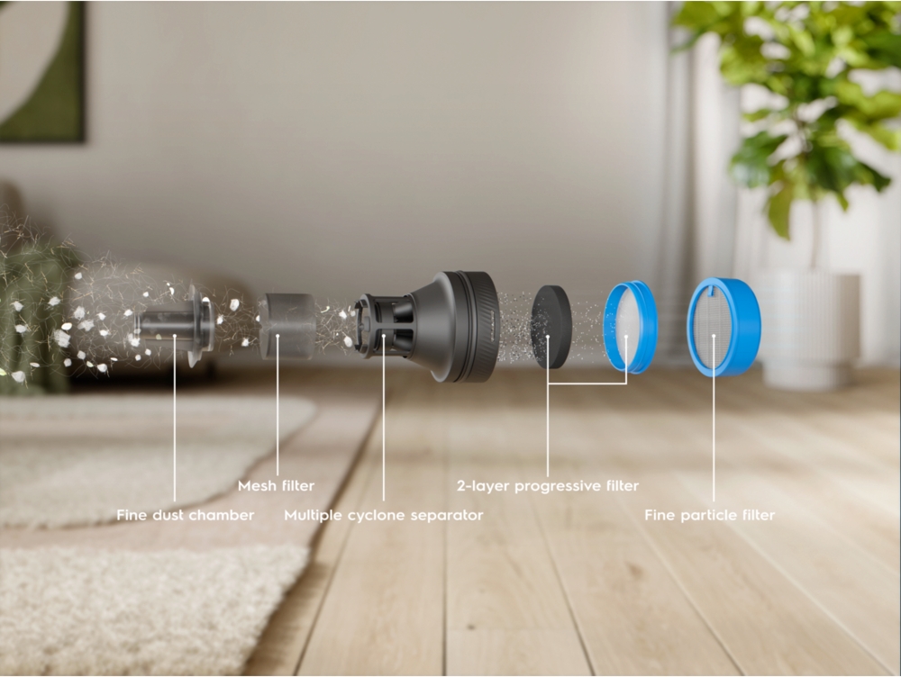 Удосконалений циклонічний сепаратор забезпечує високу тривалу потужність всмоктування, зменшуючи засмічення фільтра в 5 разів. Це зводить до мінімуму потребу очищати та замінювати фільтр надто часто.