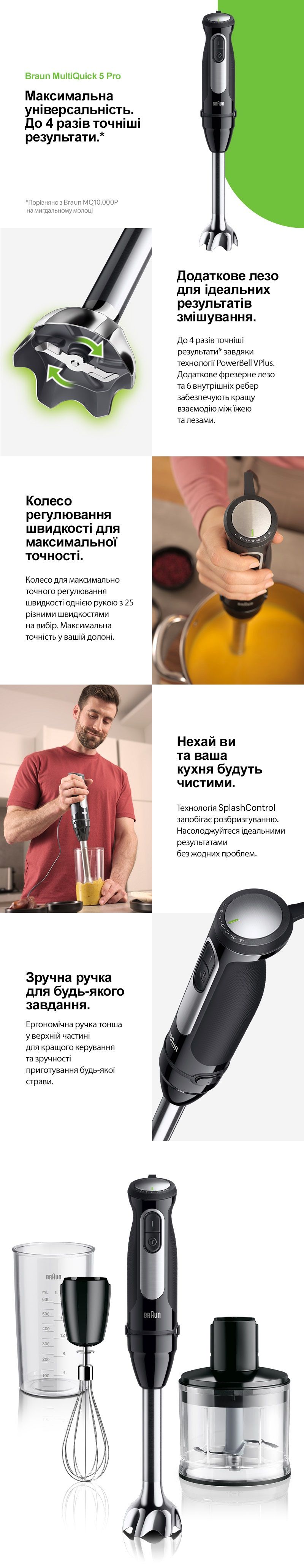 Braun MultiQuick 5 Pro MQ55236MBK - це чудовий занурювальний блендер, який підійде для приготування найрізноманітніших страв. Він потужний, зручний у використанні та має безліч функцій. Користуватися блендером легко однією рукою завдяки ергономічному дизайну та нековзній основі. М'яка ручка забезпечить приємне використання, а знімні насадки можна мити в посудомийці - жодного зайвого клопоту.