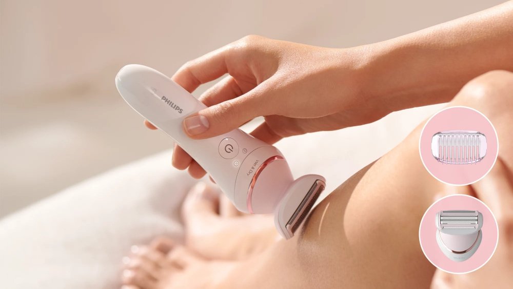 Бритвенная головка обеспечивает тщательное бритье и более мягкое применение на разных участках тела. Она поставляется с триммером-гребенкой для создания стиля в зоне бикини.