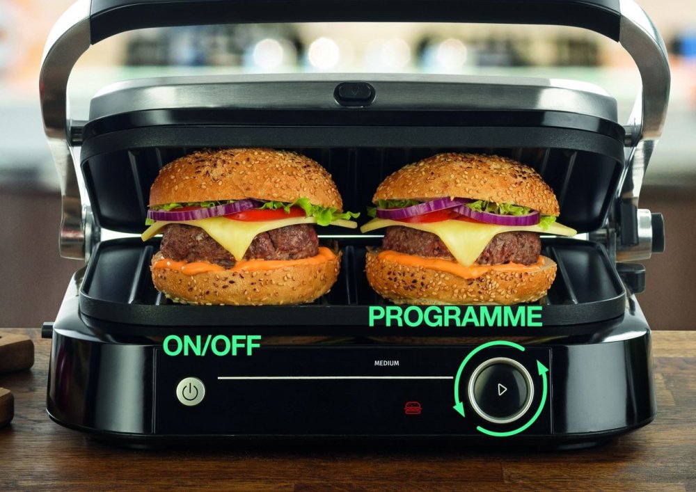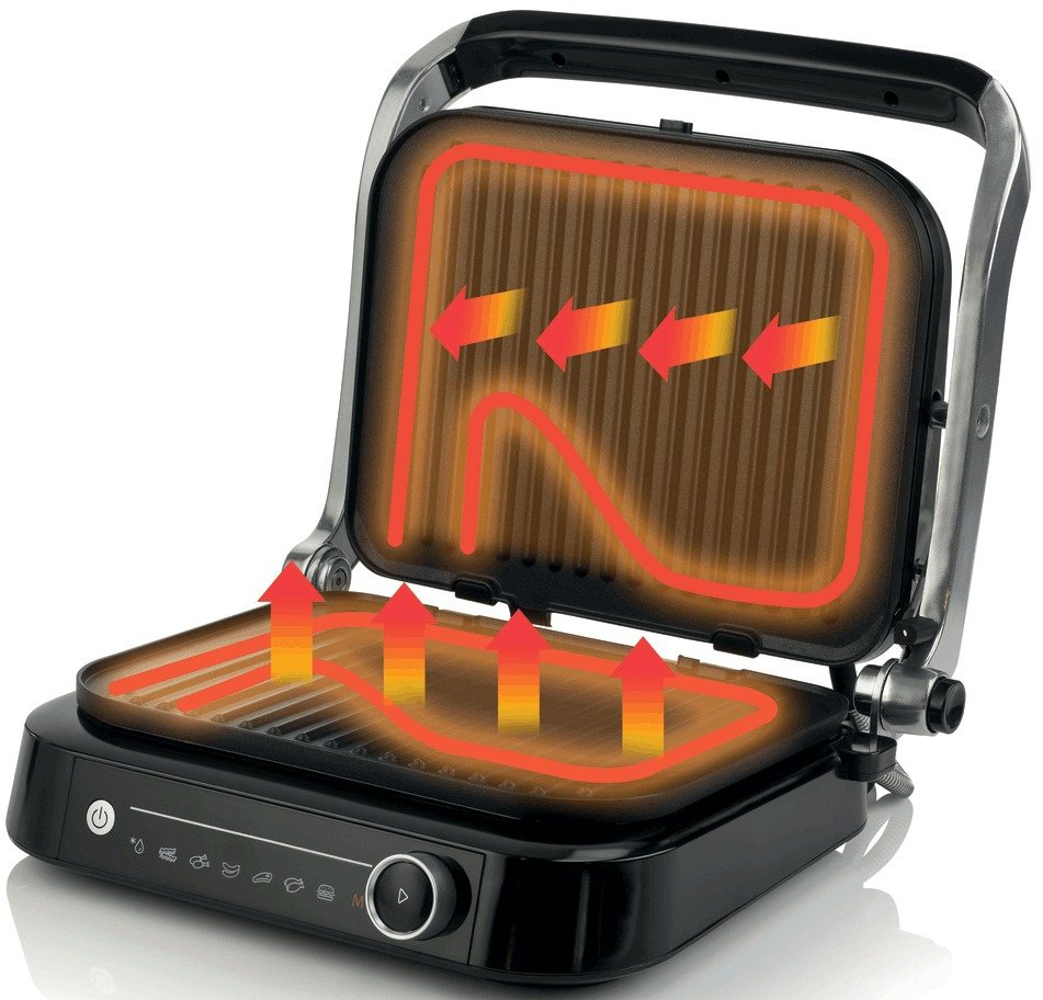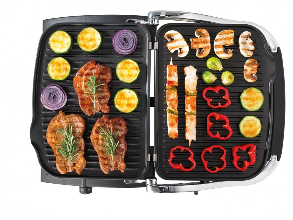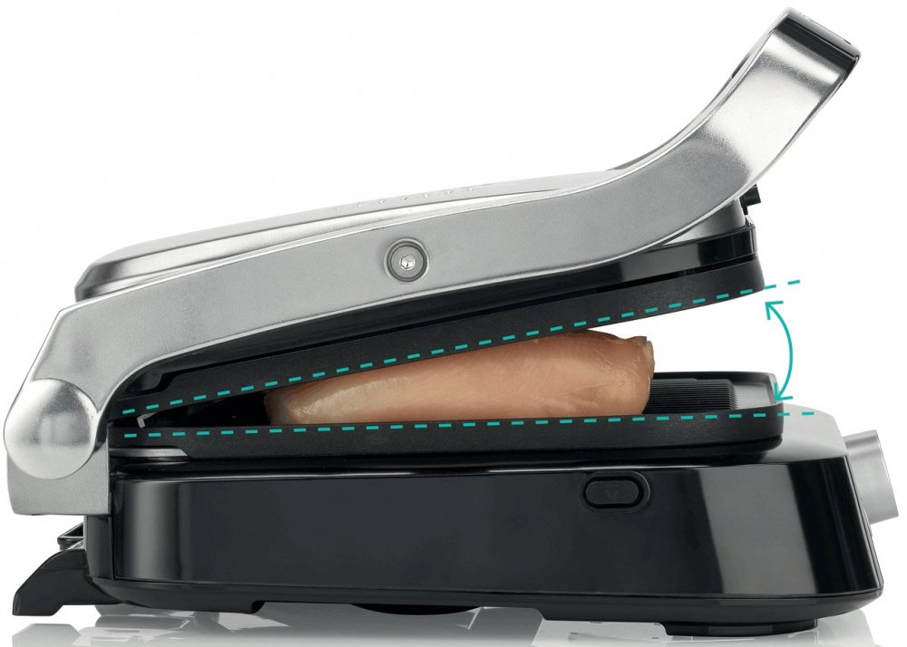 Контактный гриль можно отрегулировать в соответствии с толщиной готовящейся на нём пищи. Кроме того, верхнюю пластину гриля можно полностью откинуть назад, создав вторую жарочную поверхность, как на открытом гриле.