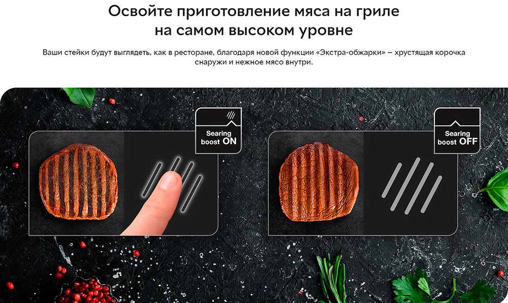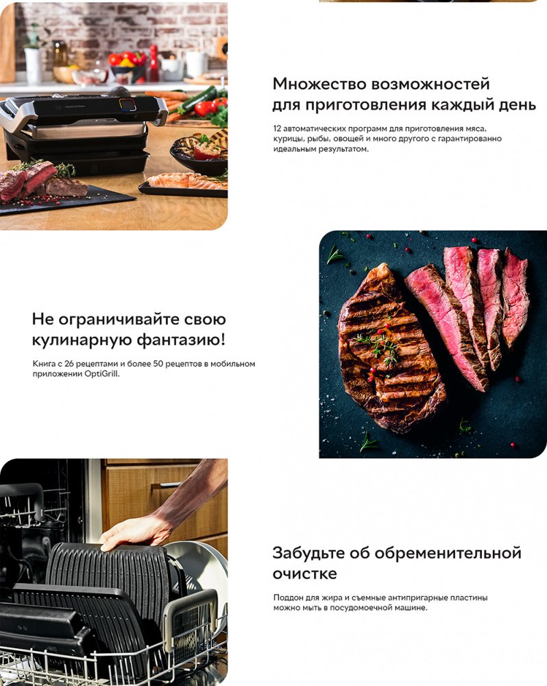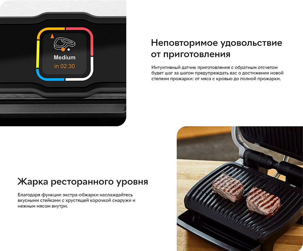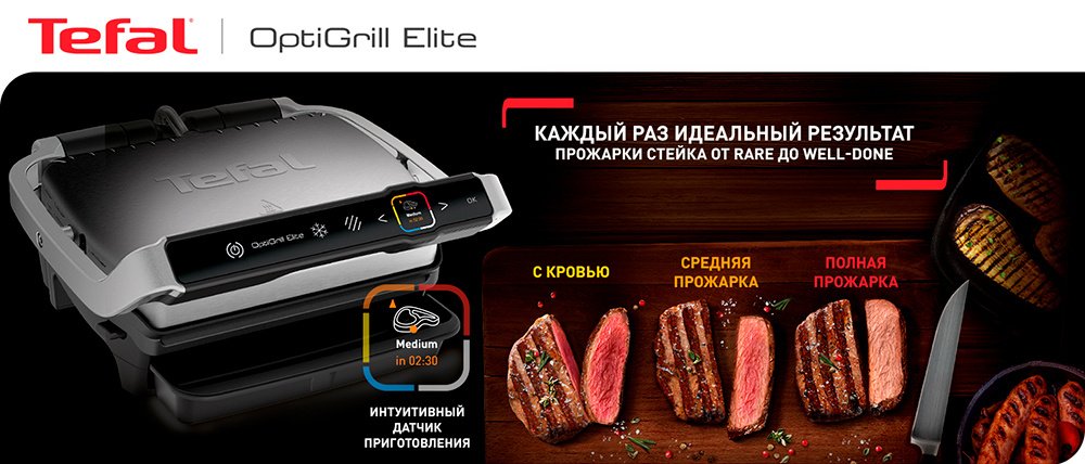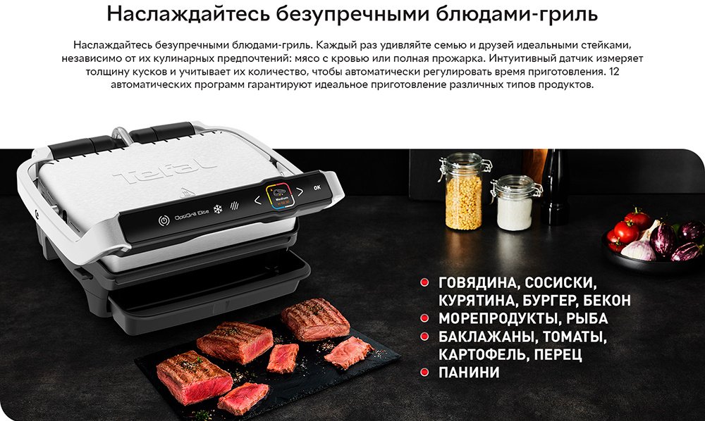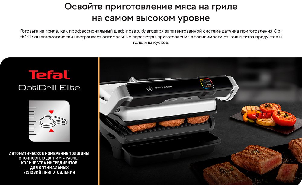 Освойте приготовление мяса на гриле на самом высоком ресторанном уровне с помощью электрического гриля OptiGrill Elite. Удивляйте семью и друзей идеальными стейками, независимо от их кулинарных предпочтений: мясо с кровью или полная прожарка. TEFAL OPTIGRILL ELITE GC750 измеряет толщину кусков и учитывает их количество, чтобы автоматически регулировать время приготовления для получения идеальных результатов прожарки. Ваши стейки будут выглядеть, как в ресторане, благодаря новой функции экстра-обжарки. Интуитивный датчик приготовления с обратным отсчетом будет шаг за шагом предупреждать вас о достижении новой степени прожарки. Двенадцать автоматических программ гарантируют приготовления вкусной курицы, рыбы, овощей и многого другого без необходимости постоянно контролировать процесс. Кроме того, съемные детали можно мыть в посудомоечной машине, что делает очистку проще простого!