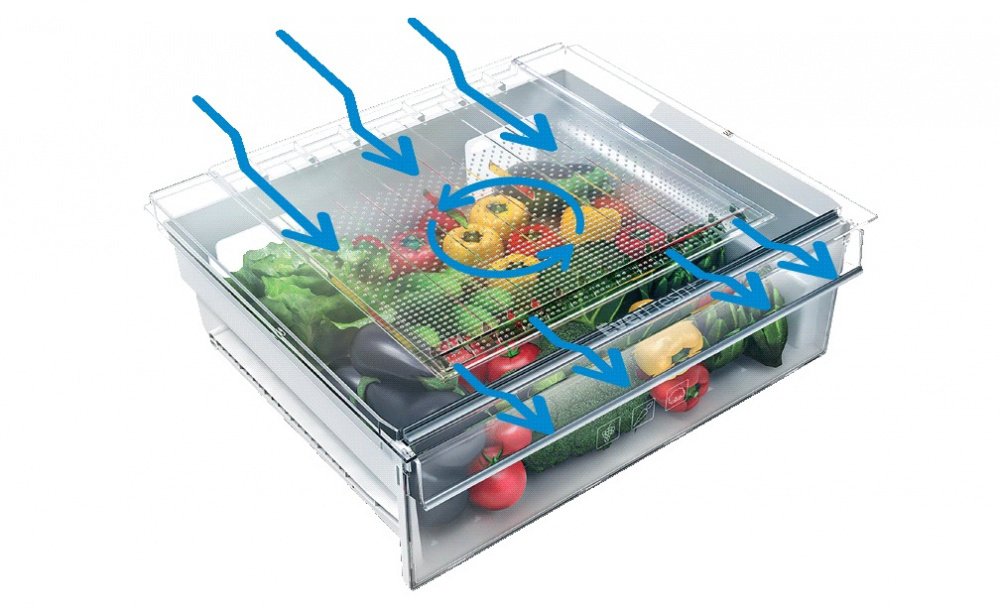 Полка над нижним ящиком оснащена специальным вентиляционным каналом и перегородкой, благодаря чему можно легко регулировать влажность в ящике, сохраняя овощи и фрукты свежими до 30 дней.