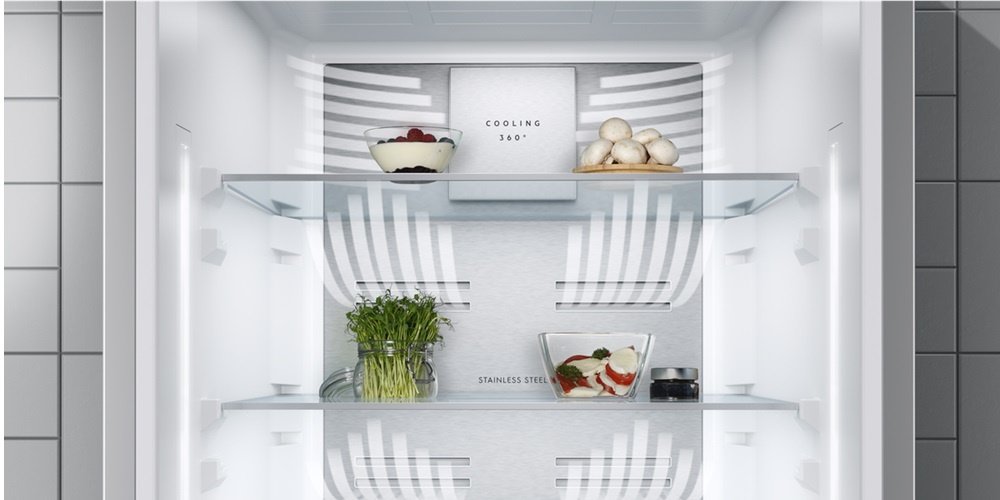 Холодильник Cooling 360° — это циркуляция воздуха по всему объему. Оптимальное распределение вентиляционных отверстий обеспечивают охлаждение в каждом уголке. Задняя стенка из настоящей нержавеющей стали улучшает дизайн и функциональность, быстро восстанавливая температуру после открывания дверцы. Продукты сохраняют хрустящую свежесть и самые тонкие природные ароматы.
