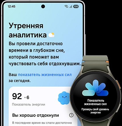 Придерживайтесь спортивных целей, отслеживая свой Показатель энергии. Синхронизируйтесь с Galaxy Watch и получайте персональные данные и советы, например анализ вашего сна, активности и частоты сердечных сокращений.