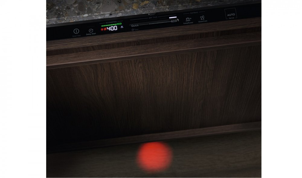 Система индикации Beam on Floor сохранит тишину на кухне. Вместо тонущих в общем шуме сигналов эта посудомоечная машина дает ясную информацию, проецируя точку на полу. Красная точка — цикл выполняется, зеленая — он завершен.