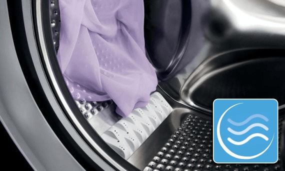 Пральна машина виконує оберти, рівномірно розподіляючи речі всередині барабана, внаслідок цього пральний засіб проникає глибше у волокна тканини та ефективніше усуває забруднення.