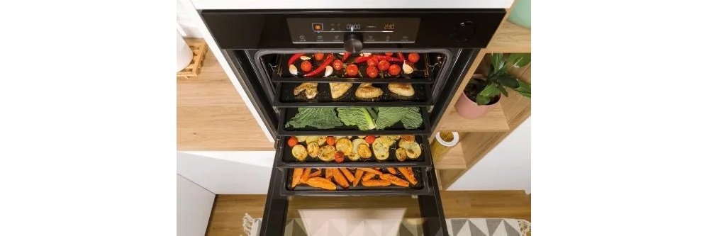 Готові до рецептів XXL? Інноваційне дизайнерське рішення Gorenje BigSpace означає збільшений внутрішній об'єм та повне використання ширини духової шафи. На кожному деку більше місця, а передова технологія забезпечує рівномірне приготування їжі на всіх рівнях.