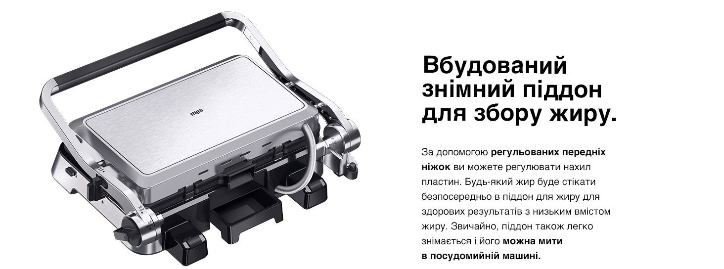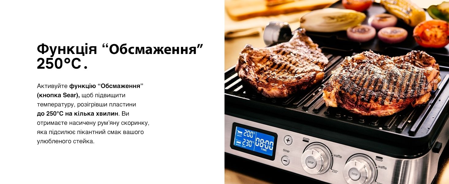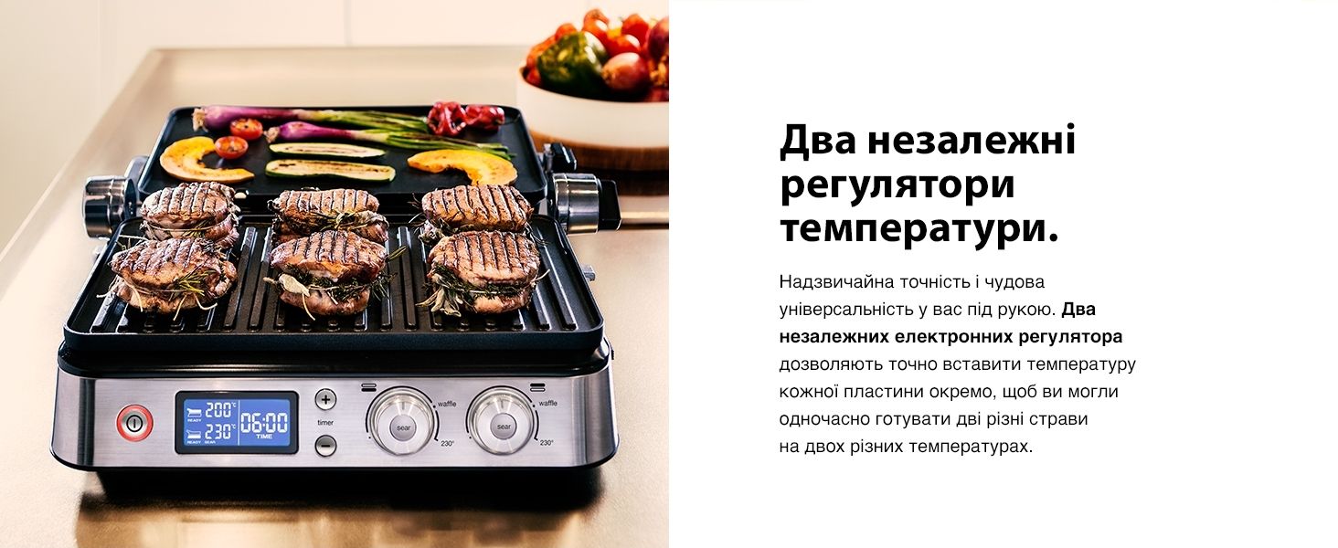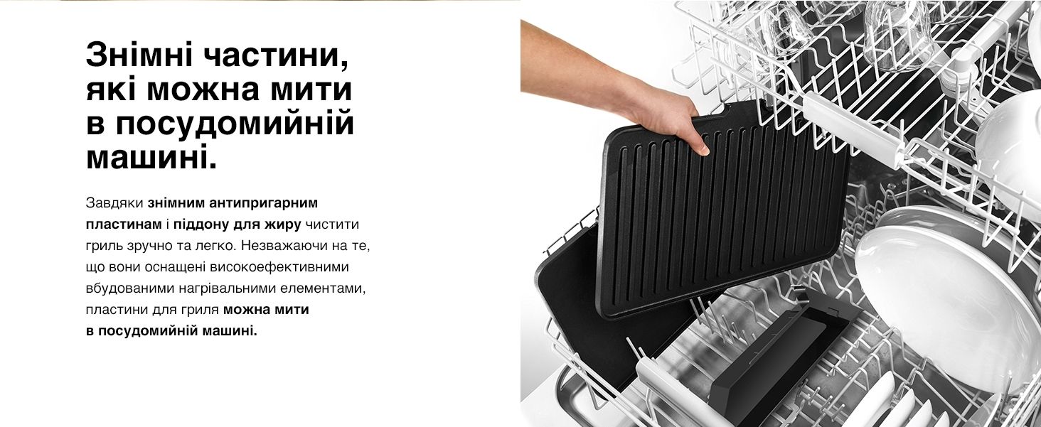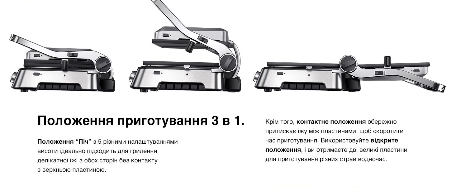 Багатофункціональний контактний гриль з 3 в 1 положеннями приготування, 3 наборами пластин, вбудованими нагрівальними елементами, незалежними електронними термостатами, функцією “Обсмажування”, знімним піддоном для жиру, елементами, які можна мити в посудомийній машині.