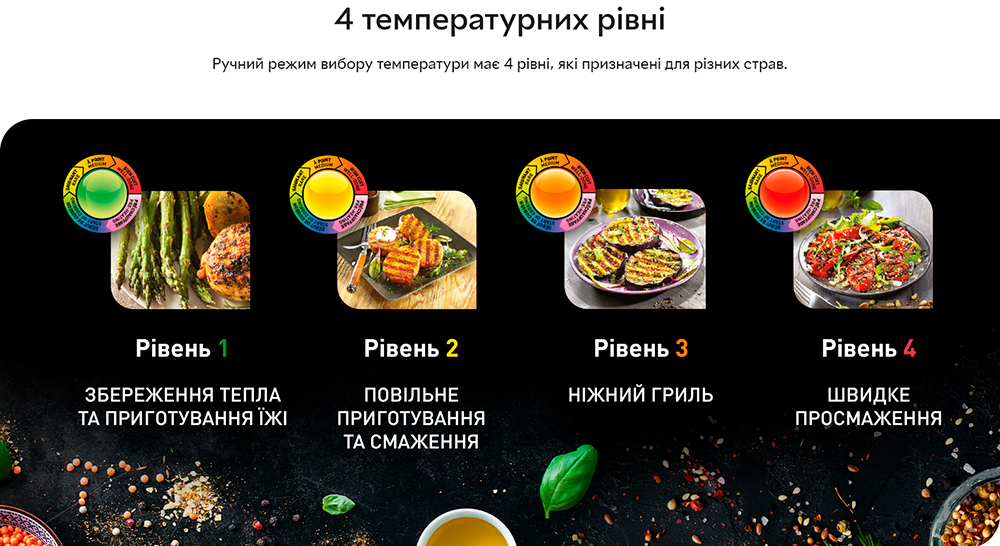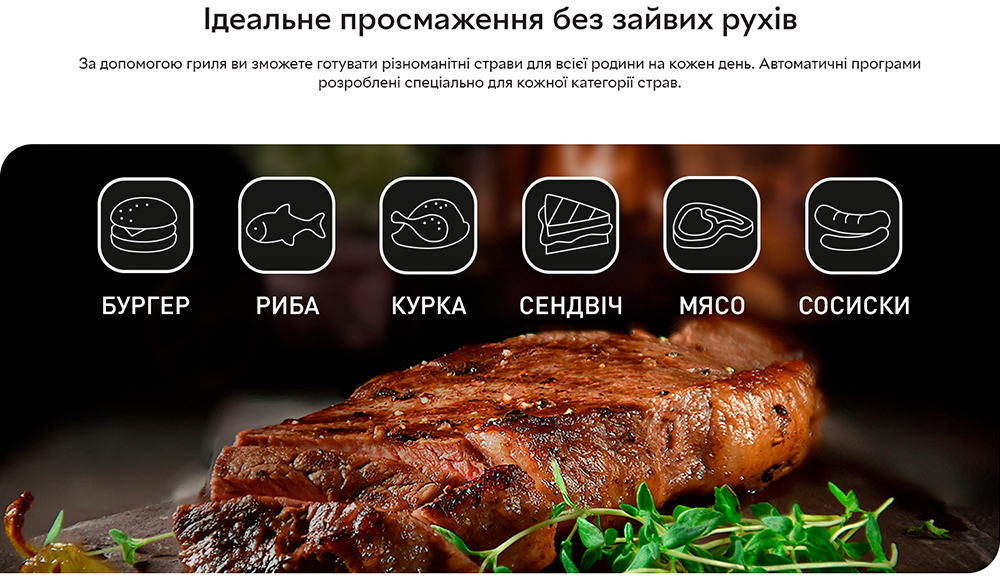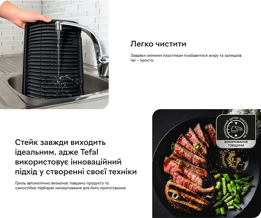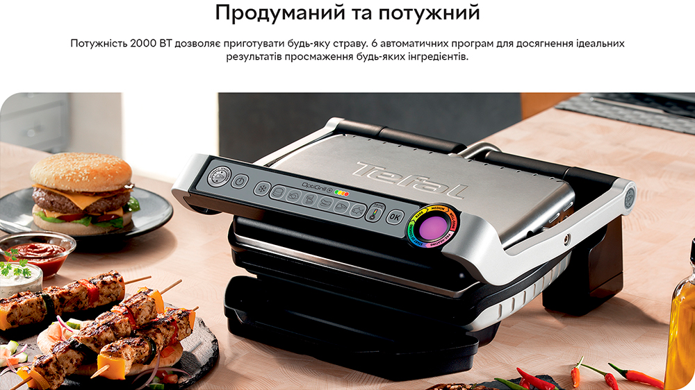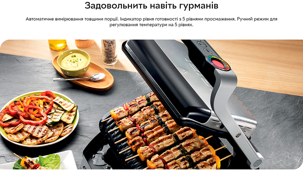 Гриль OptiGrill+ з удосконаленним ручним режимом управління забезпечує ідеальні результати приготування від Rare до Well done. Унікальна запатентована технологія: автоматичний сенсор регулює температуру в залежності від величини і товщини шматка м'яса, індикатор ступеня прожарювання для візуалізації процесу приготування. Після закінчення процесу прожарювання гриль автоматично активує функцію збереження їжі теплою.