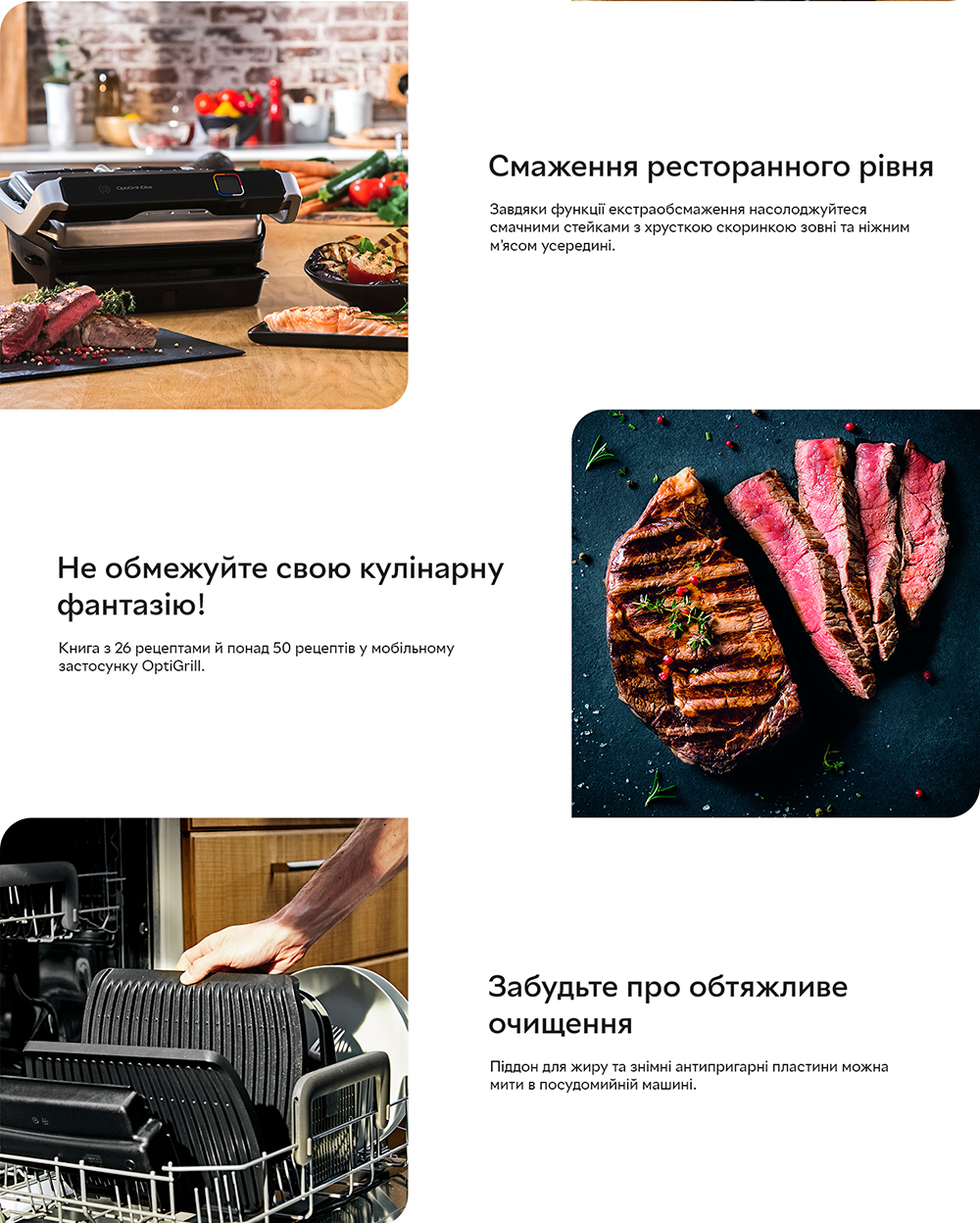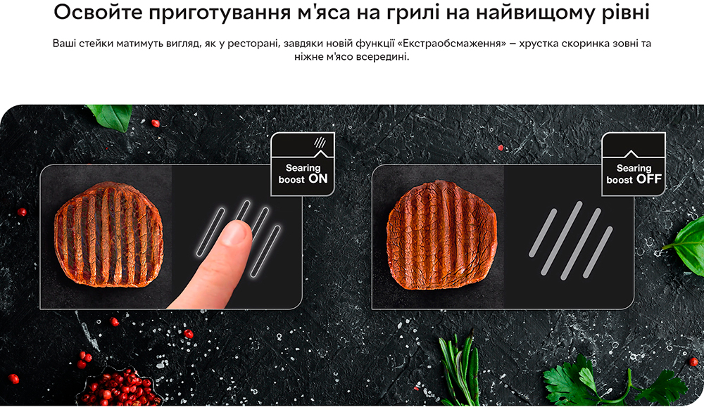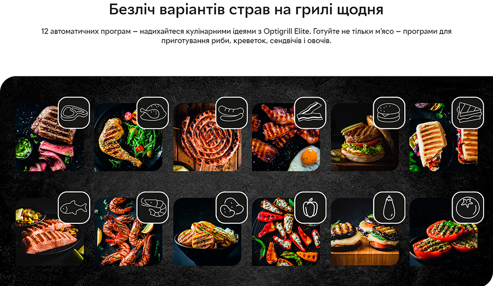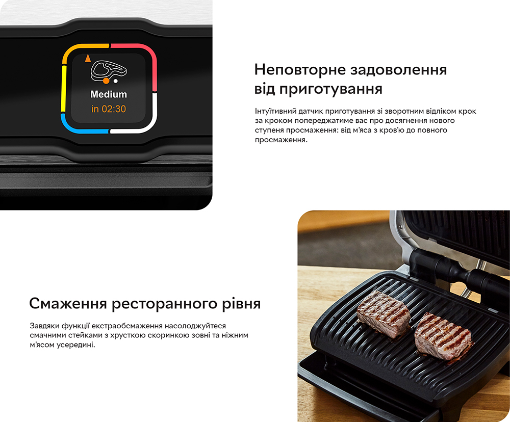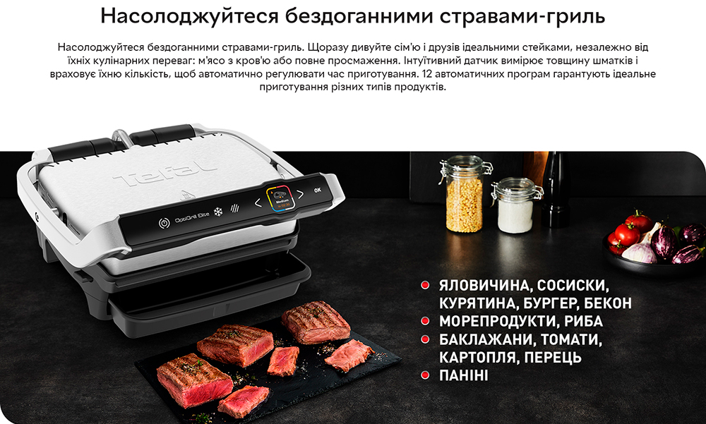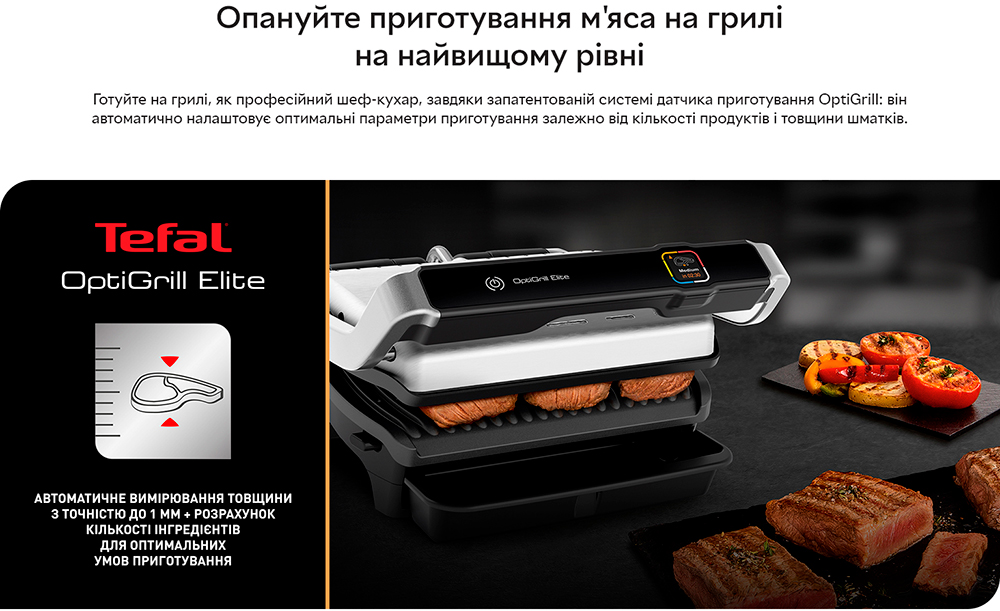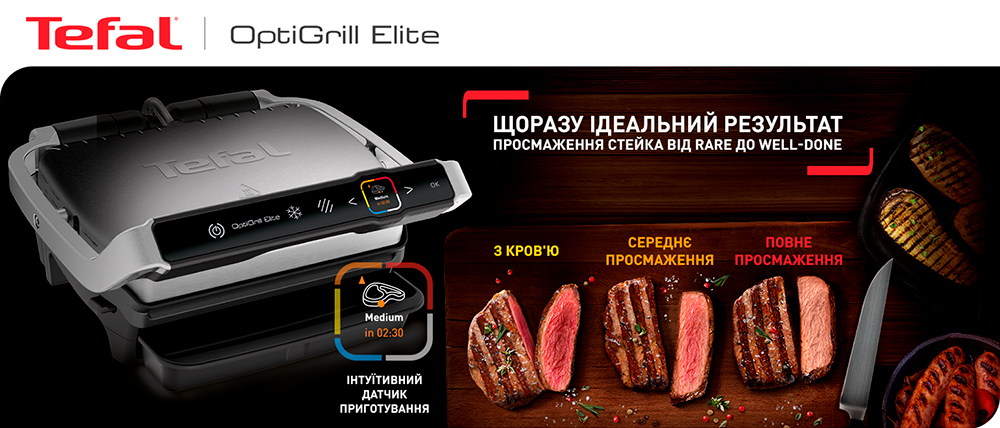 Опануйте приготування м'яса на грилі на найвищому ресторанному рівні за допомогою електричного гриля OptiGrill Elite. Дивуйте сім'ю та друзів ідеальними стейками, незалежно від їхніх кулінарних уподобань: м'ясо з кров'ю або повне просмажування. TEFAL OPTIGRILL ELITE GC750 вимірює товщину шматків і враховує їхню кількість, щоб автоматично регулювати час приготування для отримання ідеальних результатів просмажування. Ваші стейки матимуть вигляд, як у ресторані, завдяки новій функції екстра-обсмажування. Інтуїтивний датчик приготування зі зворотним відліком буде крок за кроком попереджати вас про досягнення нового ступеня підсмажування. Дванадцять автоматичних програм гарантують приготування смачної курки, риби, овочів і багато чого іншого без необхідності постійно контролювати процес. Крім того, знімні деталі можна мити в посудомийній машині, що робить очищення простішим за все!