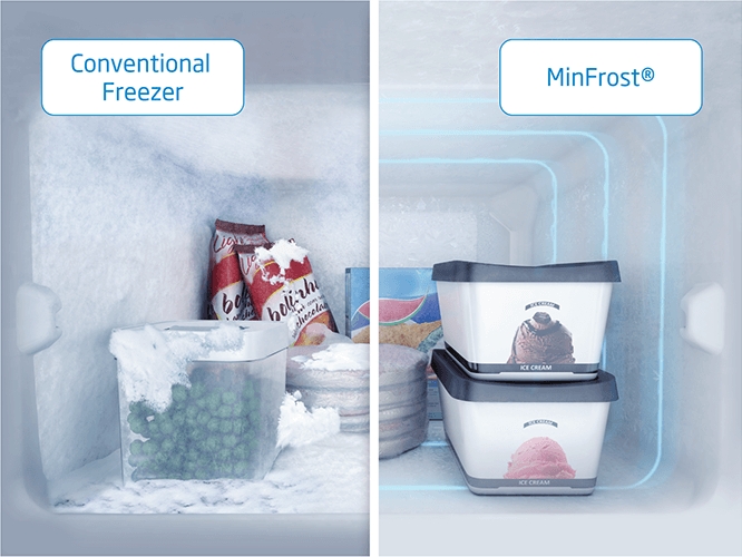 Утворення криги в холодильниках зі статичною системою охолодження призводить до змерзання продуктів один з одним і підвищення споживання електроенергії приладом. Завдяки спеціальній випарній системі MinFrost у морозильній камері утворюється набагато менше льоду. Це забезпечує краще збереження заморожених продуктів і нижче енергоспоживання, а також виключає необхідність частого розморожування морозильної камери.