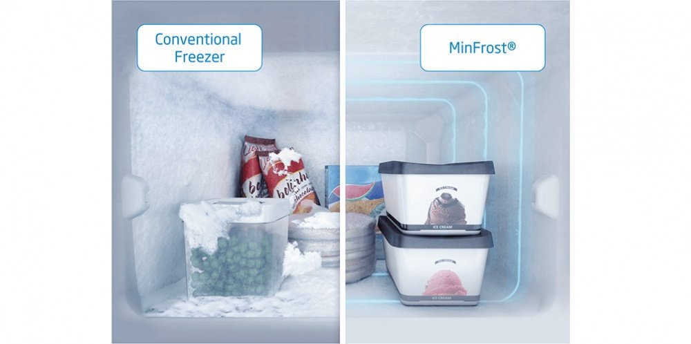 Освіта полою в холодильниках зі статичною системою охолодження призводить до змерзання продуктів один з одним і підвищенню споживання електроенергії приладом. Завдяки спеціальній испарительной системі MinFrost в морозильній камері утворюється набагато менше льоду. Це забезпечує краще збереження заморожених продуктів і більш низьке енергоспоживання, а також виключає необхідність частого розморожування морозильної камери.