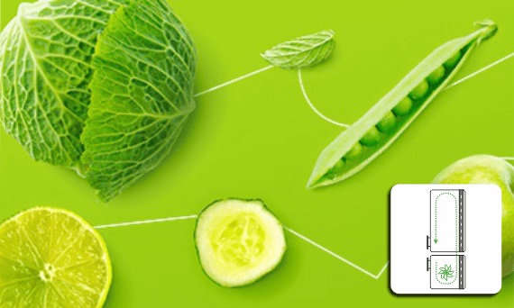 Дві шухляди з вбудованим регулятором вологості дозволяє зберігати фрукти і овочі свіжими до 15 днів. На основі зміни зовнішнього вигляду і візуальної оцінки якості в порівнянні зі звичайними фруктами і овочами. Результат внутрішнього тестування.