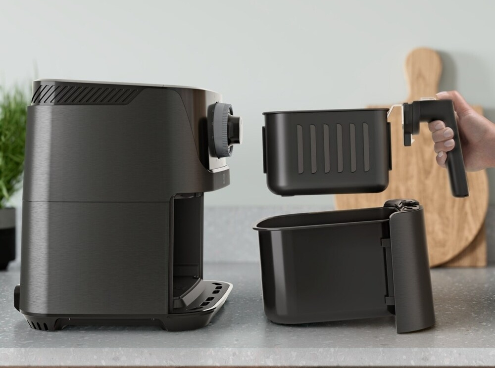 Новий дизайн передбачає зовнішню чашу та внутрішній кошик. Після завершення приготування ви з легкістю перенесете страву з кошика на тарілку, залишивши олію або зайвий сік у чаші.