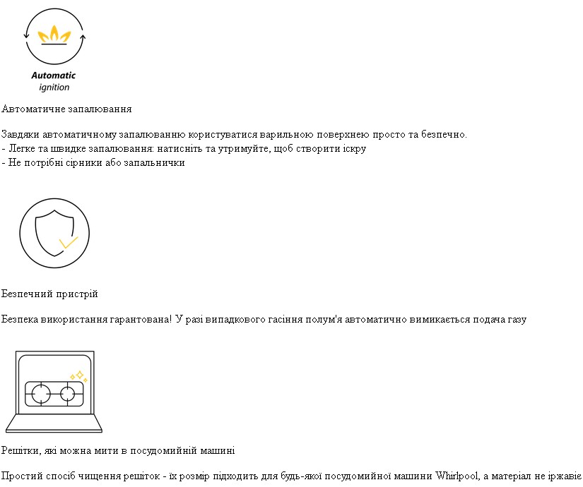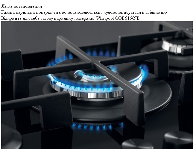 Варильна поверхня Whirlpool GOB616NB газ на склі матиме стильний вигляд на Вашій кухні. Для людей, які люблять сучасний і стильний дизайн, але при цьому потрібна газова поверхня? Газ на склі варильної поверхні Whirlpool стане оптимальним рішенням. Варильна поверхня Whirlpool GOB616NB з чавунними решітками довговічна і надійна. Крім того чавунні решітки ширші, ніж з іншого матеріалу, тому ваші каструлі та сковорідки будуть більш стійкими під час приготування. Автоматичне електрозапалювання варильної поверхні Whirlpool, це можливість підпалювати конфорку однією рукою без використання сірників.