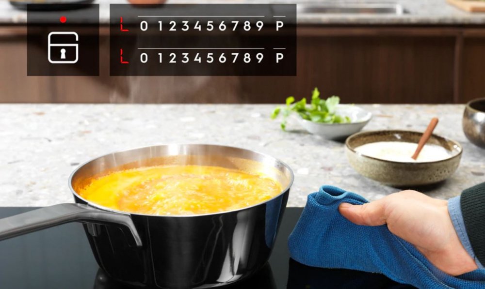 Функція «Ключ» вручений поверхні збереже налаштування приготування навіть при випадковому торканні панелі керування – наприклад, дітьми. Це також дозволить вам стерти бризки, не перериваючи процес приготування.