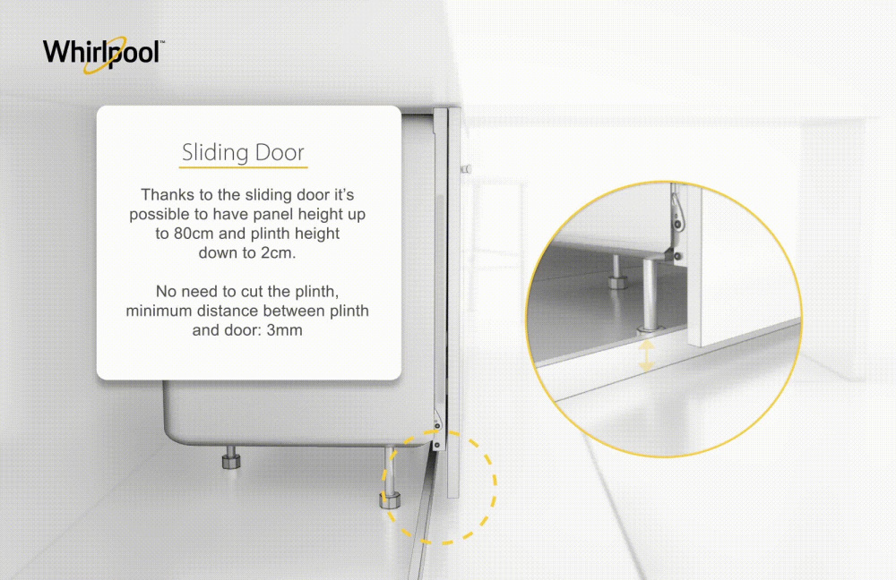 Посудомийна машина Whirlpool створена, щоб забезпечити простий монтаж для будь-якого типу кухонних меблів. Завдяки новим розумним петлям встановлення посудомийної машини буде дуже простим і дасть змогу легко регулювати її висоту. Так, висота фасаду тепер може бути зменшена до 80 см, а ширина плінтуса може скоротитися до 2 см.